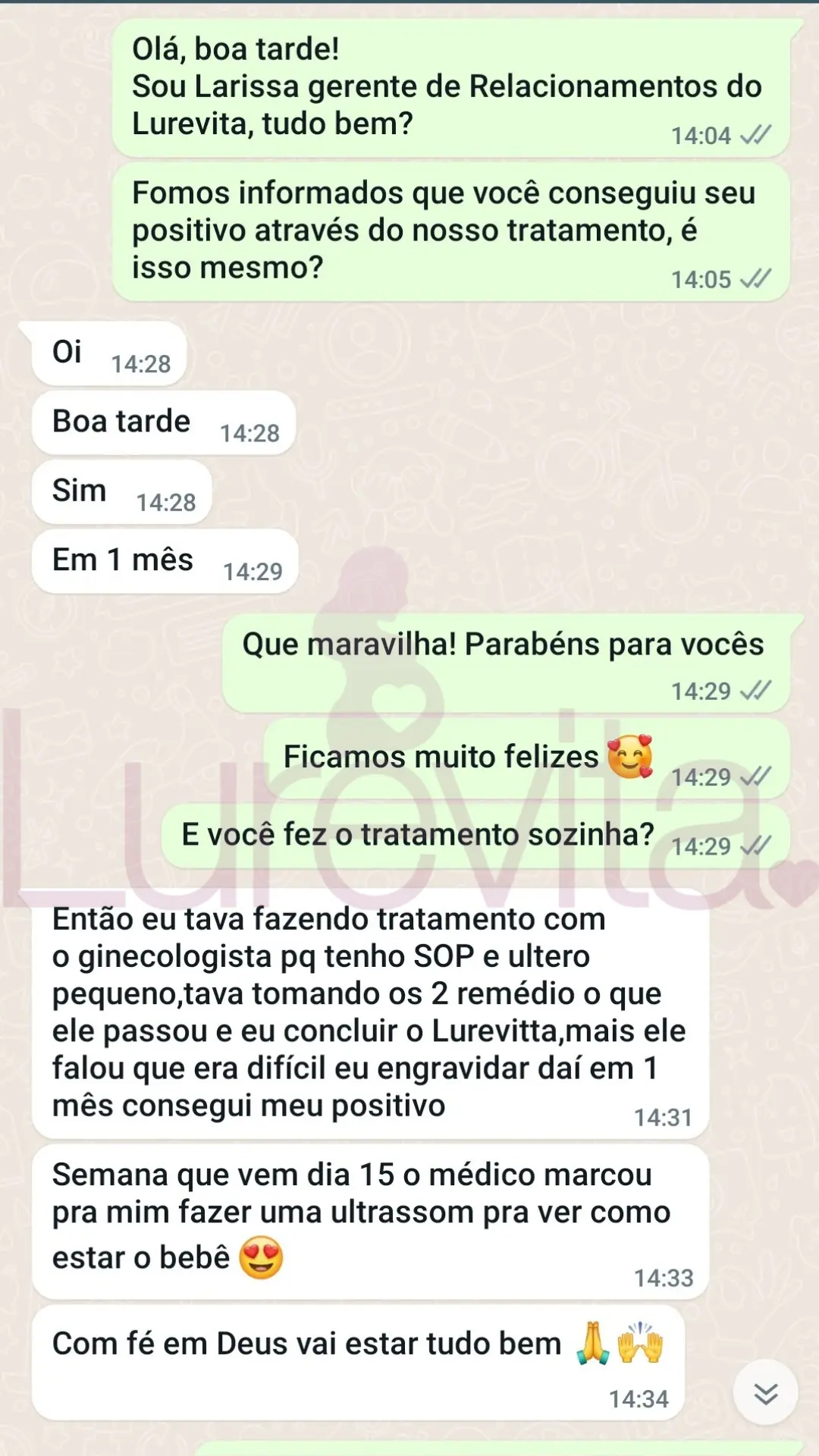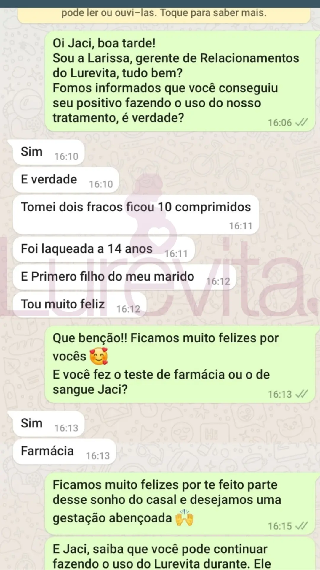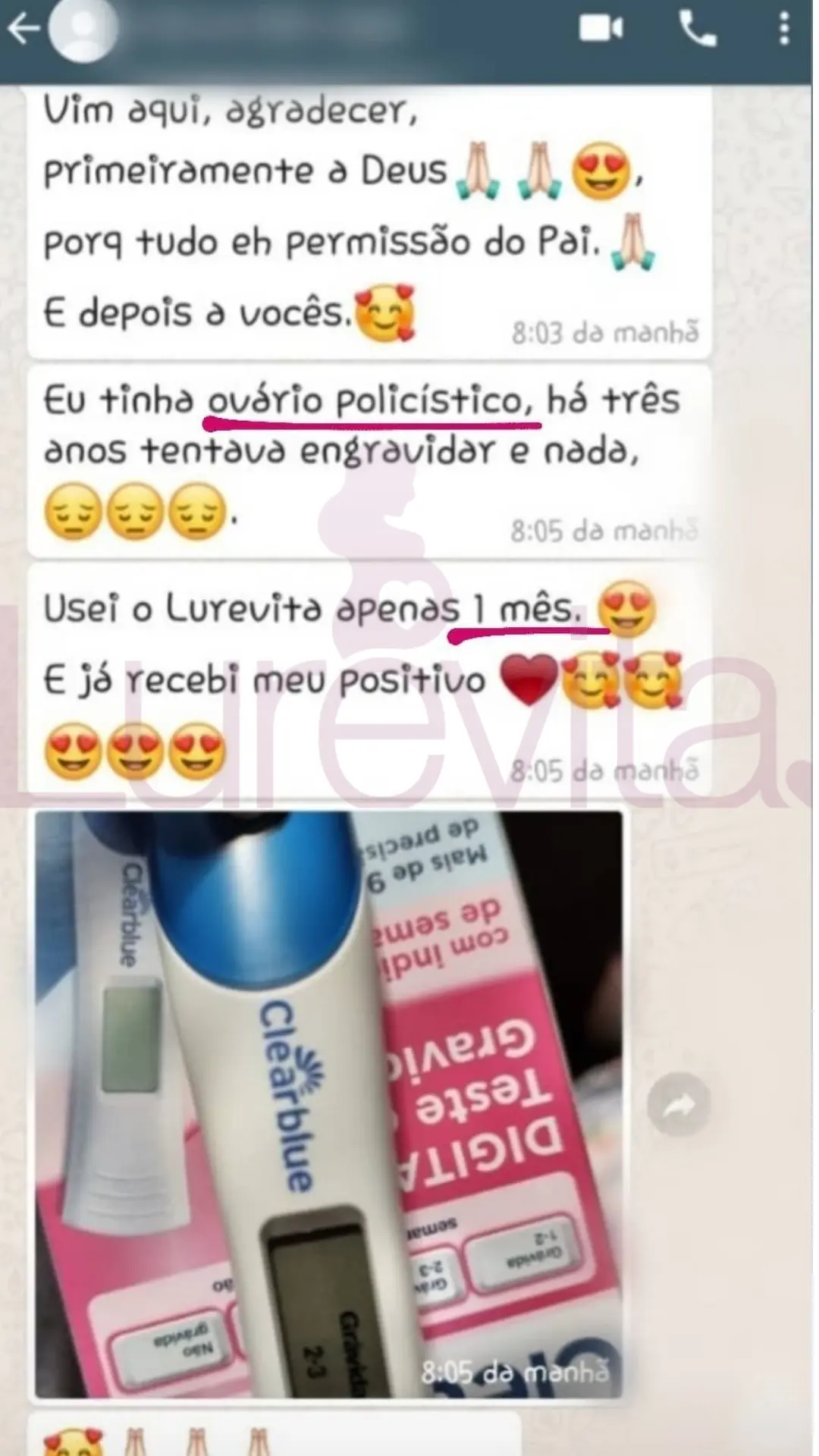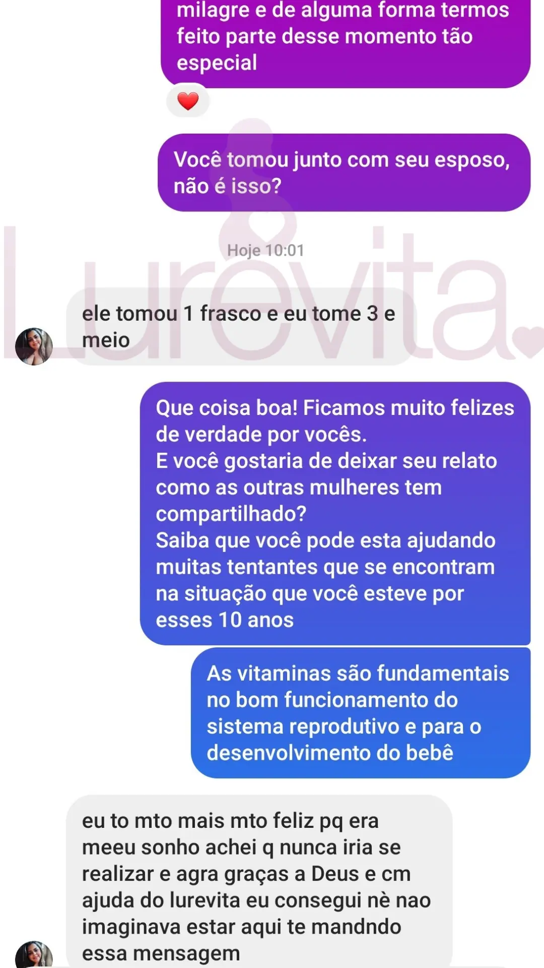 Vale lembrar que cada corpo reage de um jeito ao produto, por esse motivo temos clientes que conseguiram com 2 meses de uso, outras com 5 meses de uso e algumas conseguiram depois de 8 meses de uso. O importante é saber que com o Lurevita, as suas chances de conseguir seu positivo são maiores!