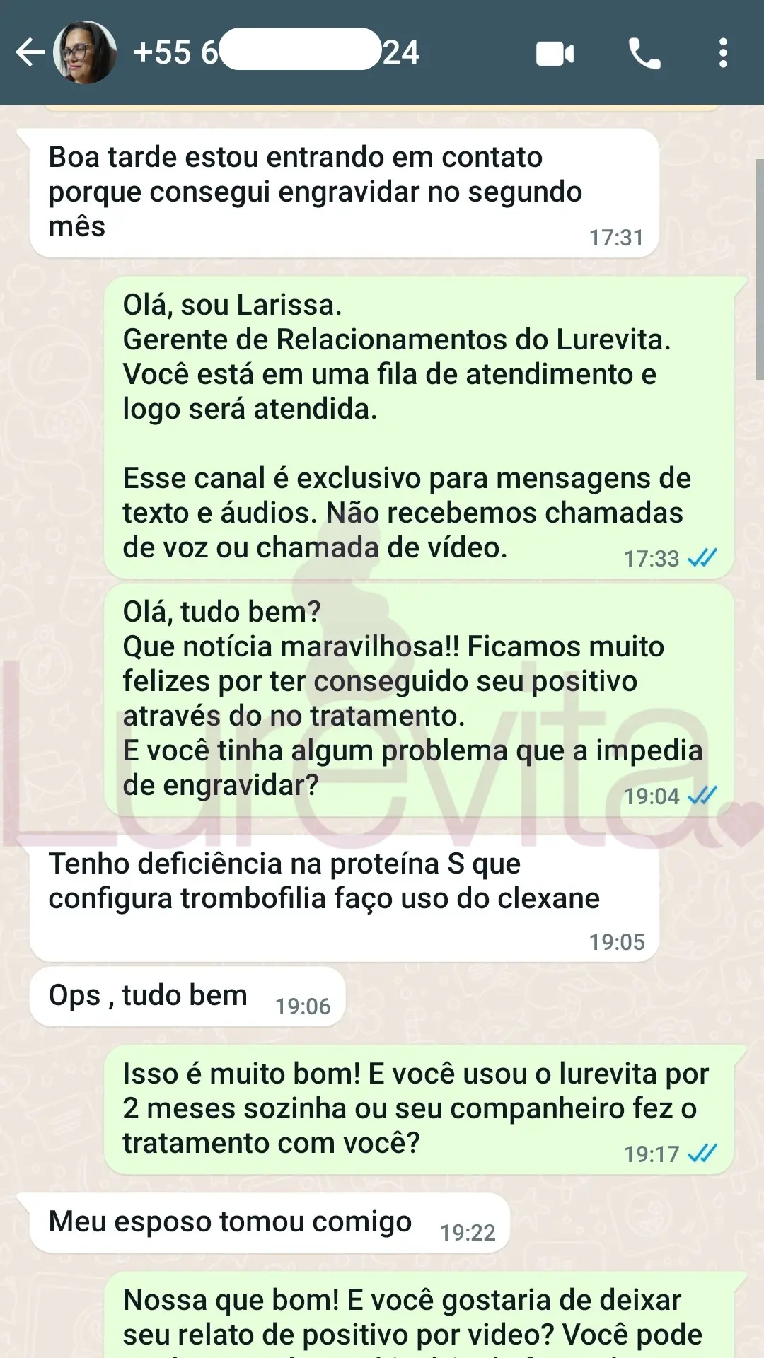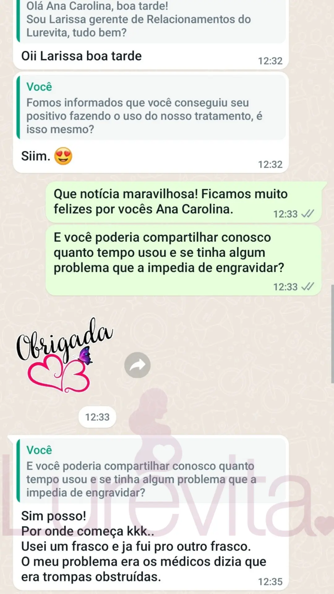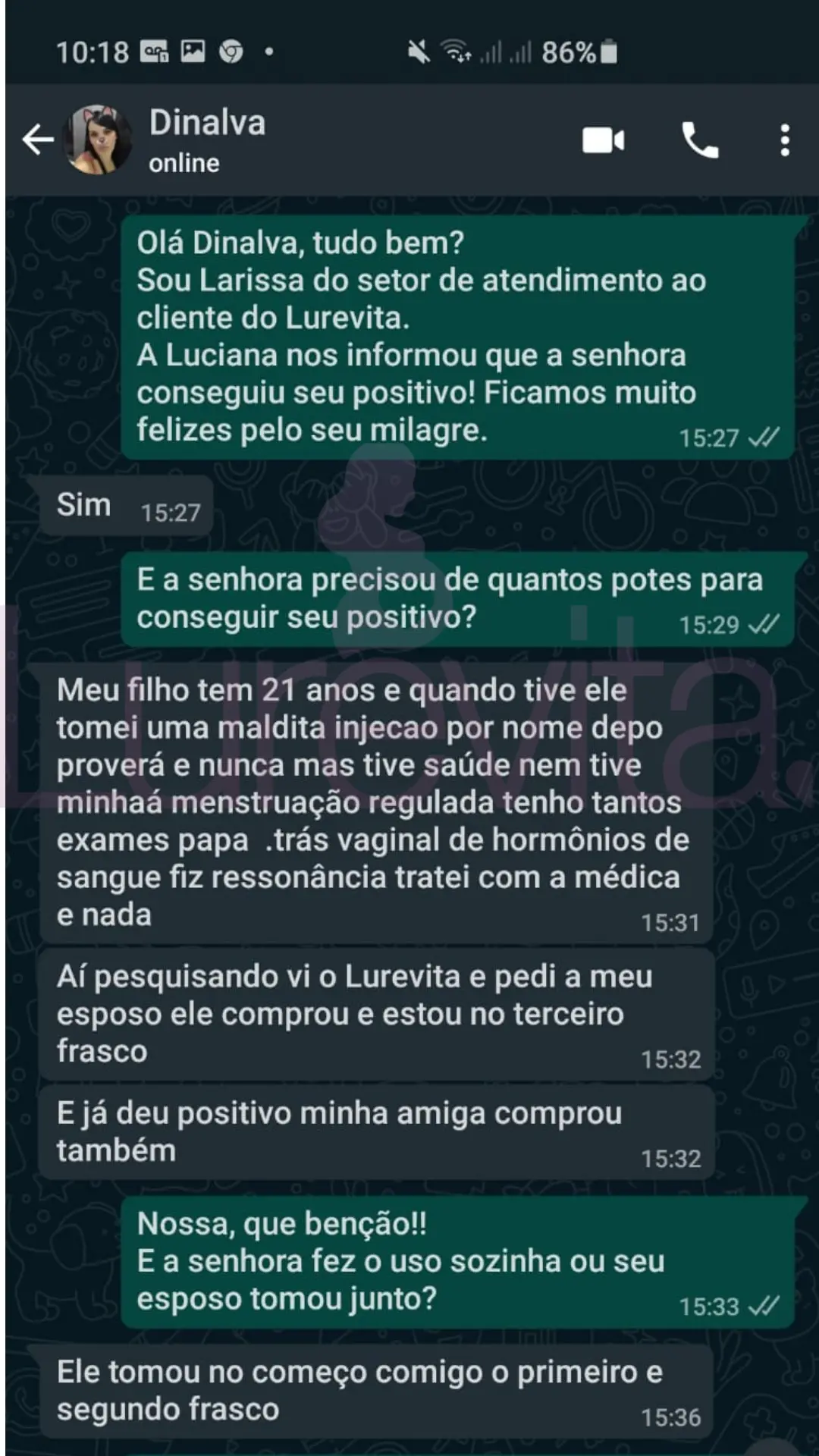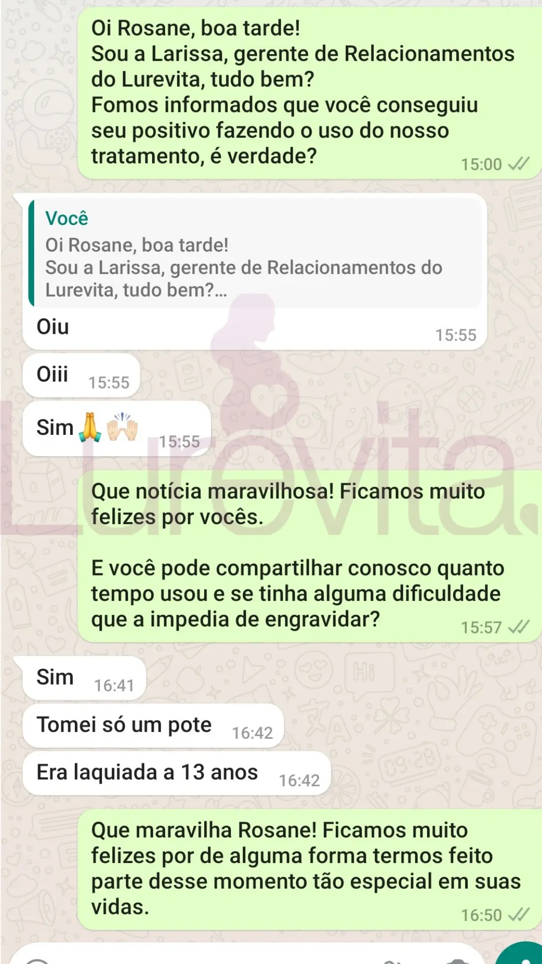 Vale lembrar que cada corpo reage de um jeito ao produto, por esse motivo temos clientes que conseguiram com 2 meses de uso, outras com 5 meses de uso e algumas conseguiram depois de 8 meses de uso. O importante é saber que com o Lurevita, as suas chances de conseguir seu positivo são maiores!