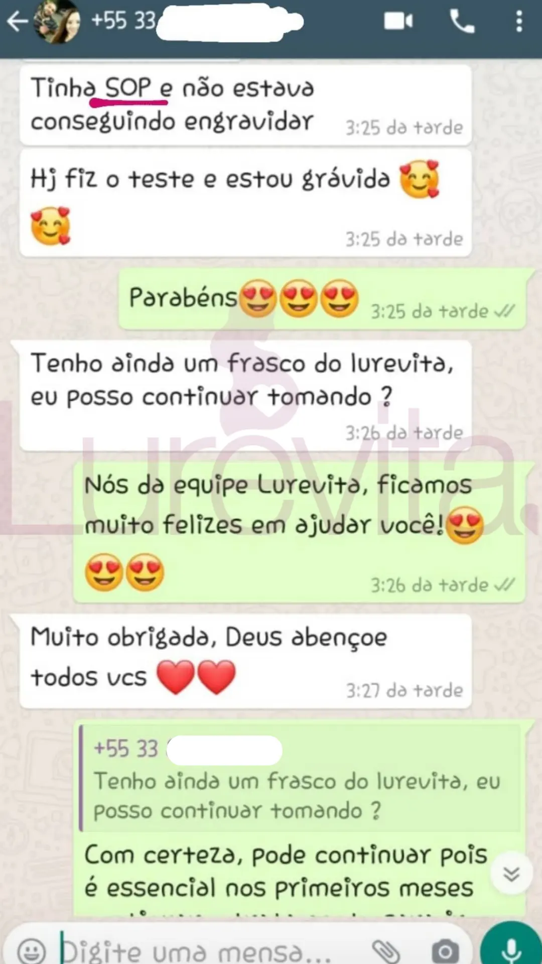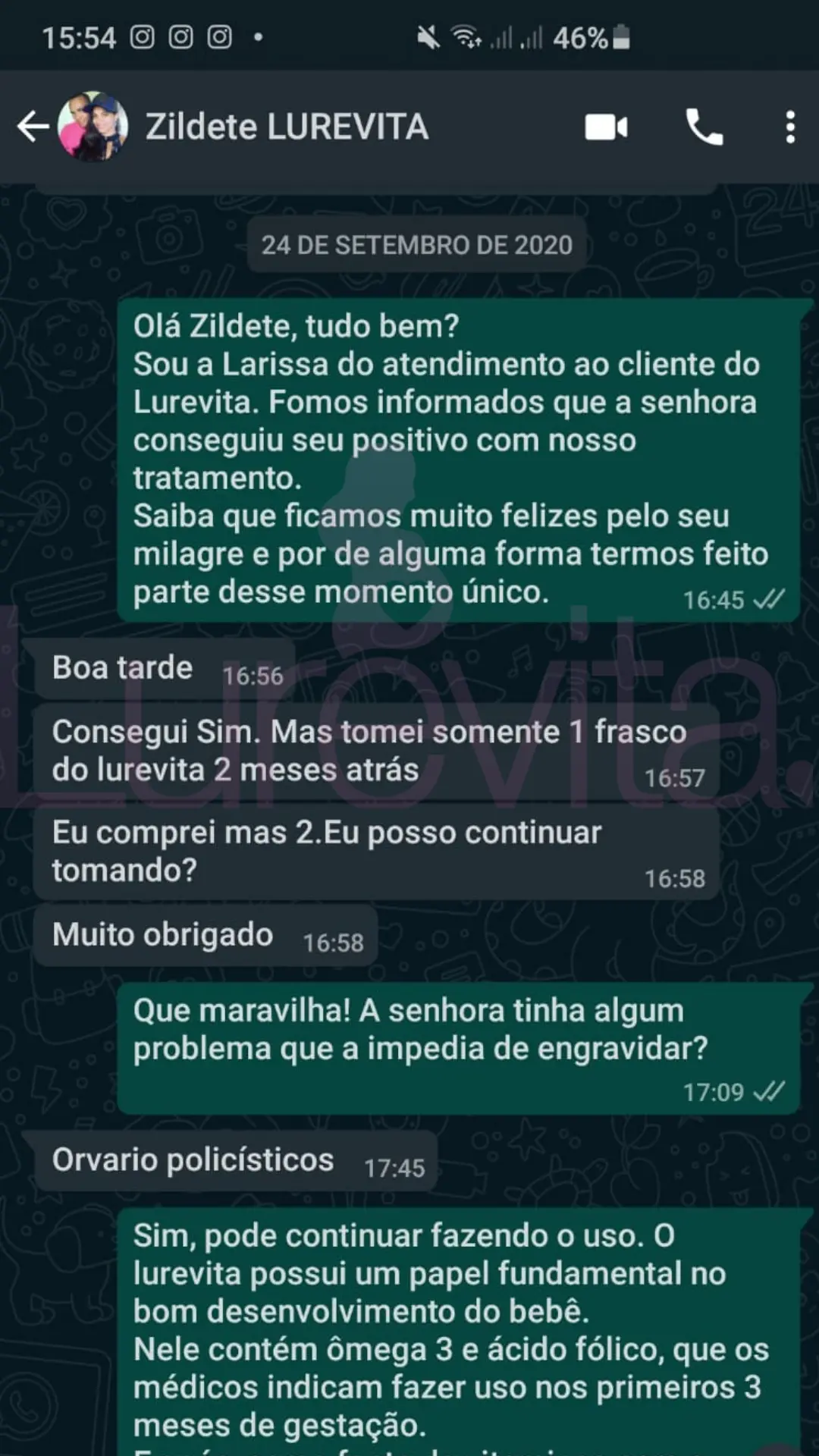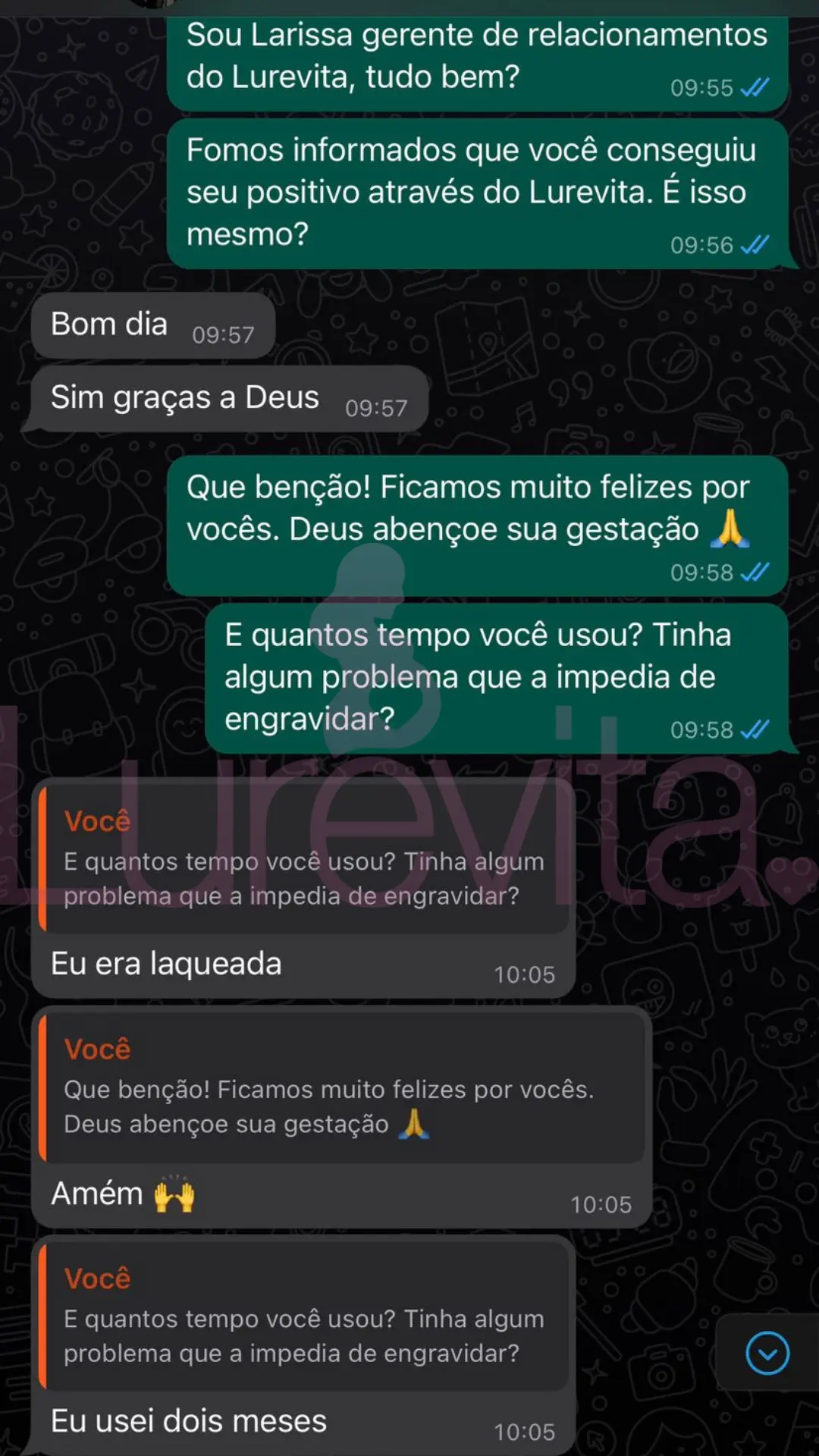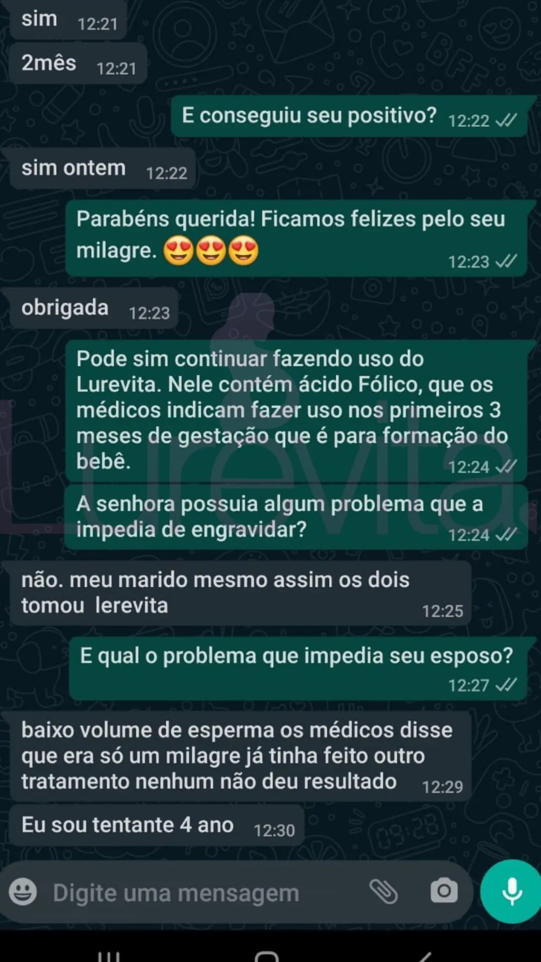 Vale lembrar que cada corpo reage de um jeito ao produto, por esse motivo temos clientes que conseguiram com 2 meses de uso, outras com 5 meses de uso e algumas conseguiram depois de 8 meses de uso. O importante é saber que com o Lurevita, as suas chances de conseguir seu positivo são maiores!