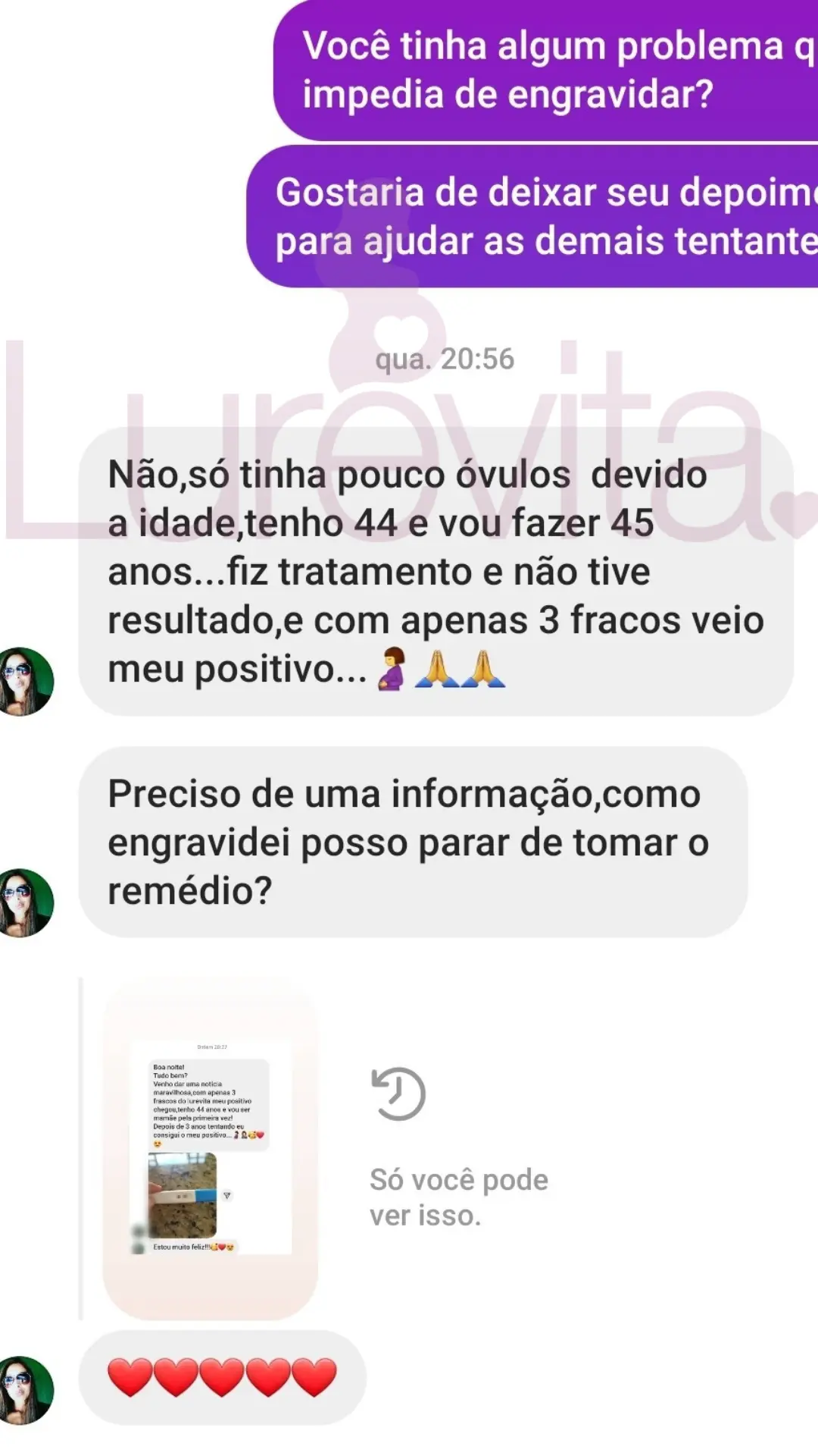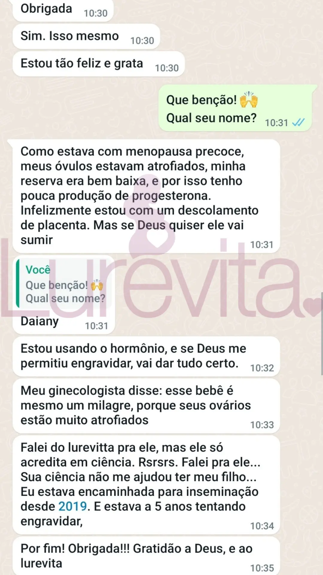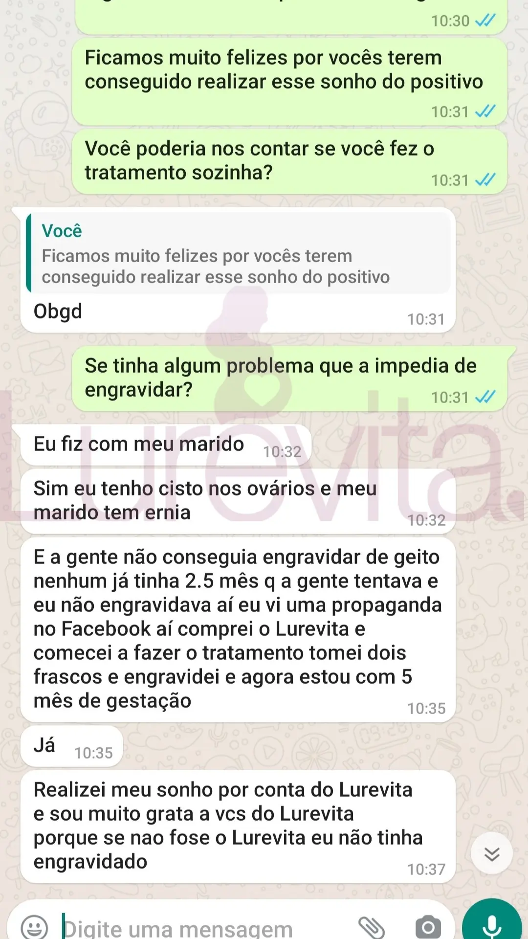 Somos uma empresa séria e não vamos ficar te prometendo que vai engravidar com 1 mês de uso só pra você comprar. Temos sim clientes que conseguiram engravidar com 1 ou 2 meses de uso do Lurevita, mas não são todas que conseguem com esse tempo de uso do produto.